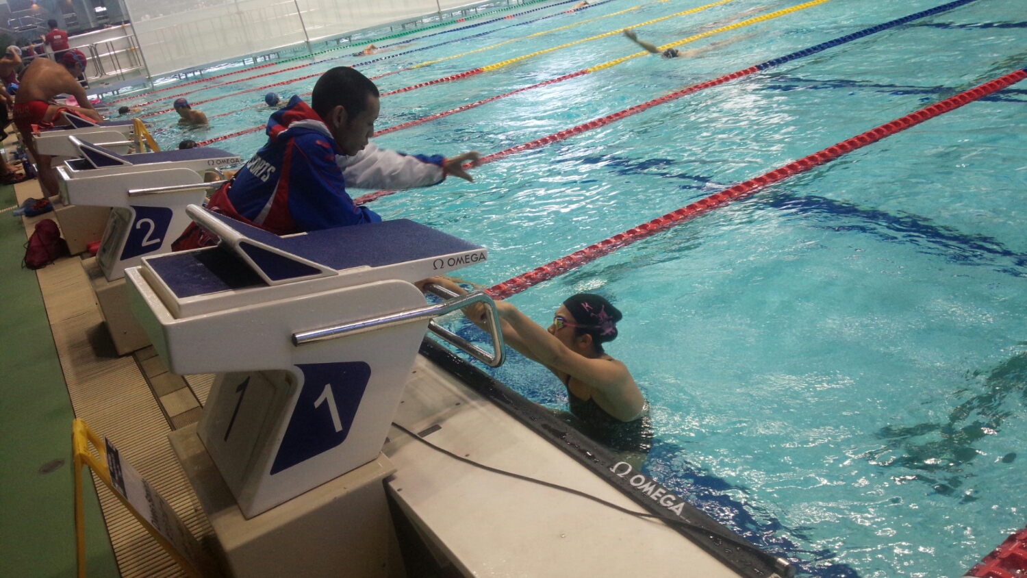 本来ならいIDカードがないと入れないのですが、フジジは水泳連盟にも知っている人が多く、ちゃんとIDカードを用意してくれました。しかもVIP席まで用意してもらって本当に感謝です。スイミングクラブ協会のお仕事を真面目にしていてよかったなぁ・・って思います。