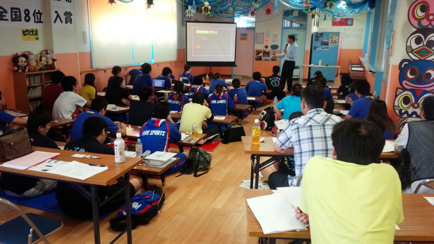 今日は岡山の川崎医療福祉大学から小野寺昇教授を招き、高齢者が健康で長生きするための運動と知識の勉強をしました。また、午後は横浜からお越しいただいた宇野佳子先生に高齢者に効果のあるチェアエクササイズとアクアエクササイズを紹介していただきました。