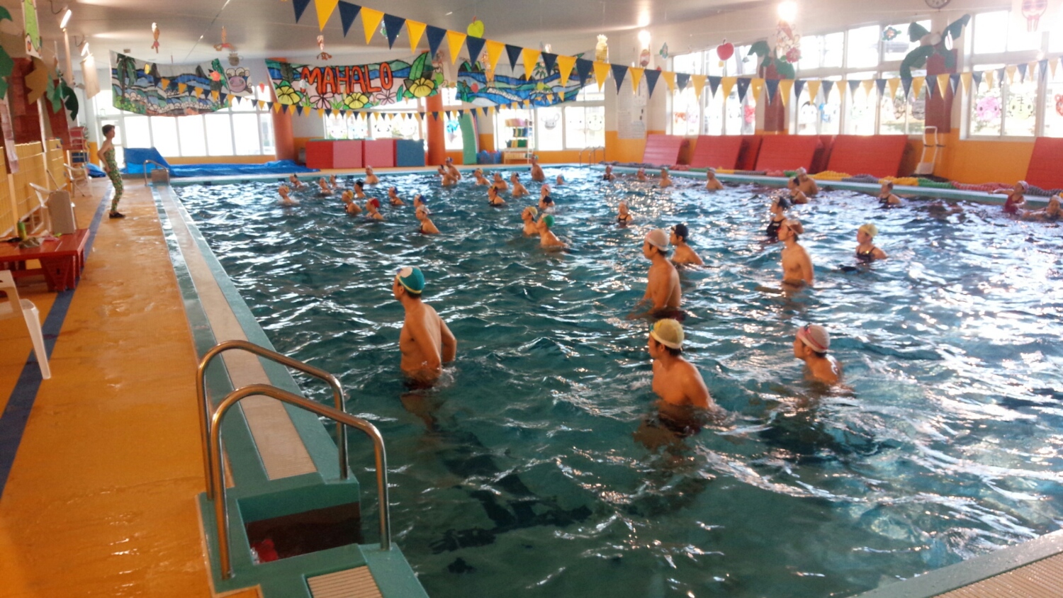 ここピュア福島南を会場に、朝から46名の勉強熱心なコーチが集まり、高齢者の水中運動関係の講習会を開催しています。