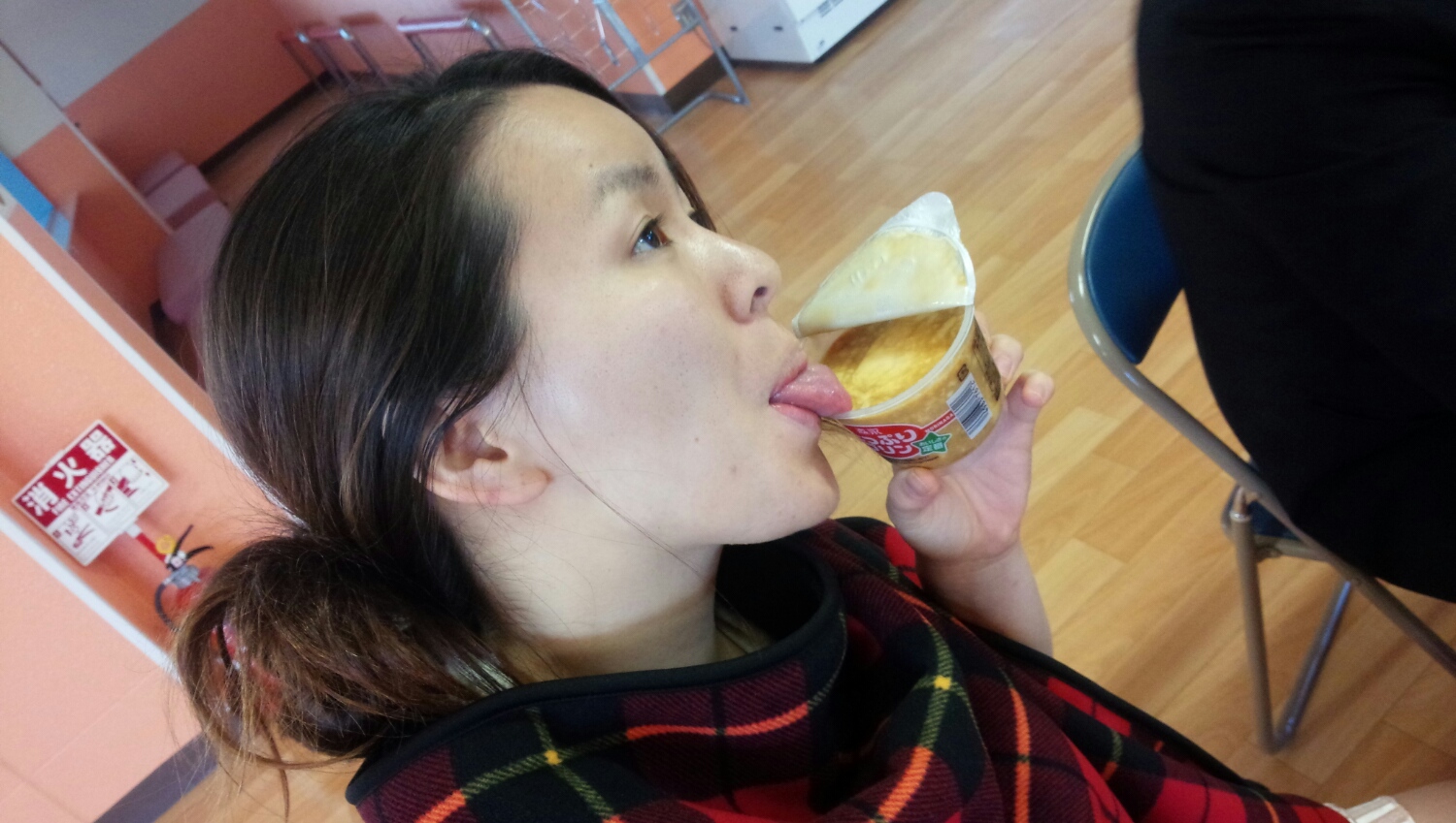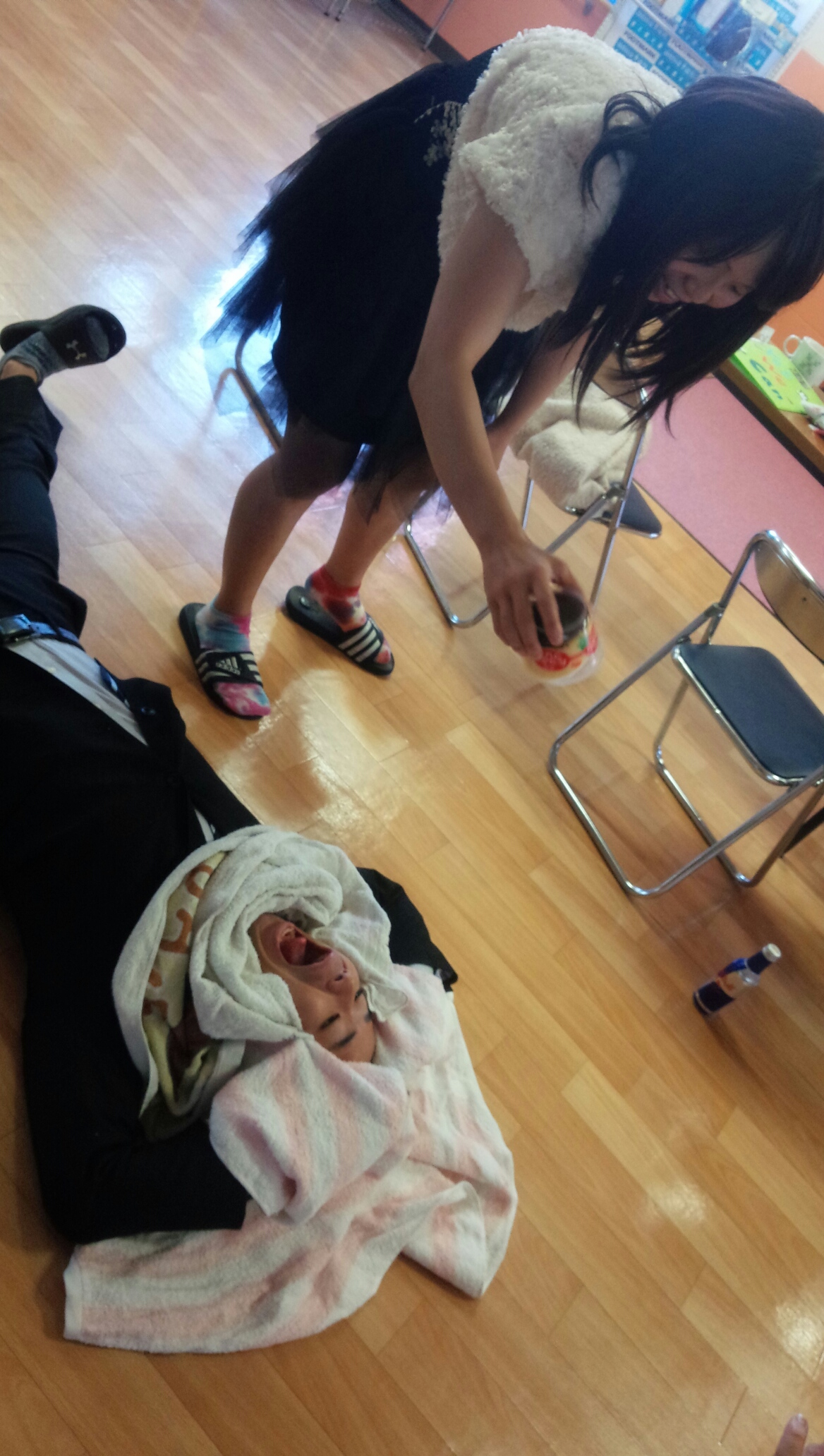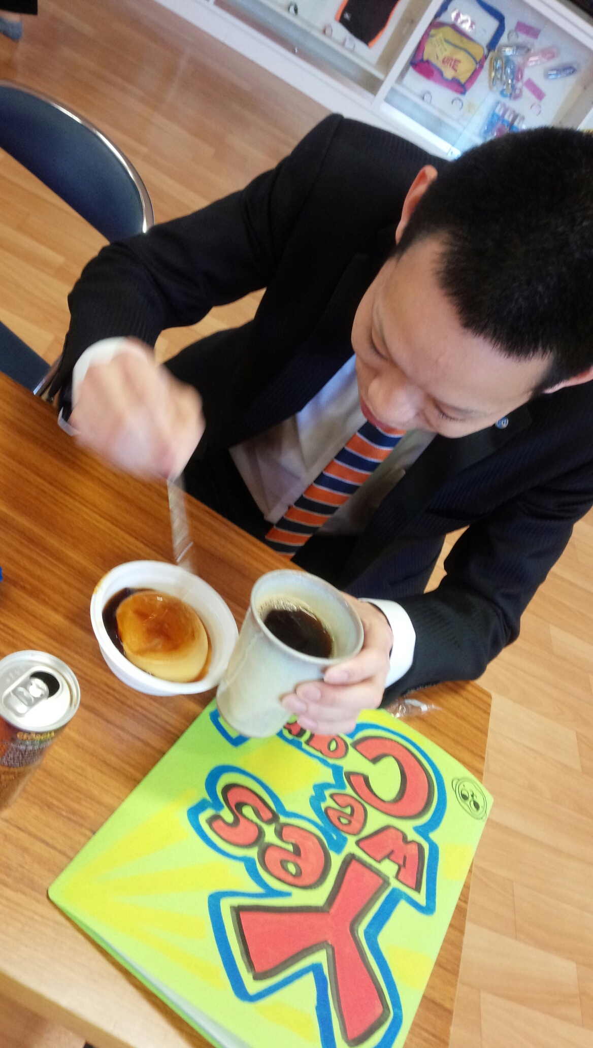 JOが上からプリンを落として